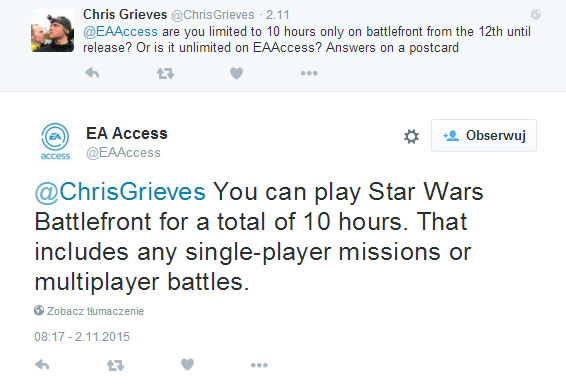 Elektronicy ujawnili na Twitterze, że trial Star Wars Battlefront pozwoli nam na 10 godzin gry. Będziemy mogli przez ten czas bawić się w misjach dla pojedynczego gracza oraz walczyć w walkach wieloosobowych.