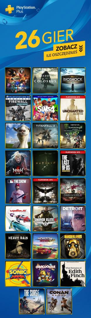 Sony pokazało na swojej infografice tytuły, jakie mogliśmy w minionych miesiącach pobrać w Plusie. Wśród nich znajduje się wiele hitów, jak choćby The Last of Us: Remastered, Uncharted: Kolekcja Nathana Drake’a, Nioh, Detroit: Become Human czy Titanfall 2. Obecnie – w ramach oferty PS Plus marzec 2020 – na graczy czeka kolejna mocna gra w postaci Shadow of the Colossus (2018) oraz średniaka Sonic Forces.