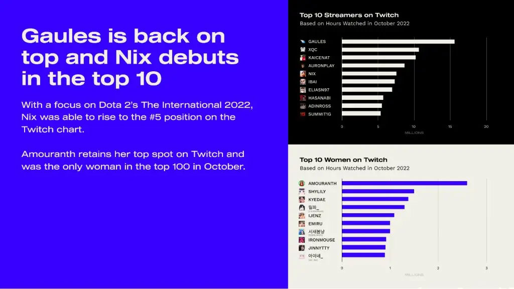 Warto wspomnieć, że niezwykle popularna streamerka Pokimane nie załapała się w październiku do TOP 100, a zazwyczaj widzieliśmy ją w comiesięcznych rankingach oglądalności. Wynika to z tego, że dziewczyna po prostu nie transmitowała w zeszłym miesiącu zbyt często.