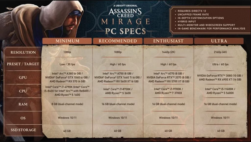 Ubisoft podzielił się wymaganiami sprzętowymi Assassin’s Creed Mirage w wersji na PC. Całą specyfikację znajdziecie poniżej. Na szczęście nie musicie się bać, że gra wymęczy Wasze komputery. Tym razem jest naprawdę odpowiednio, choć optymalizacja to druga kwestia.