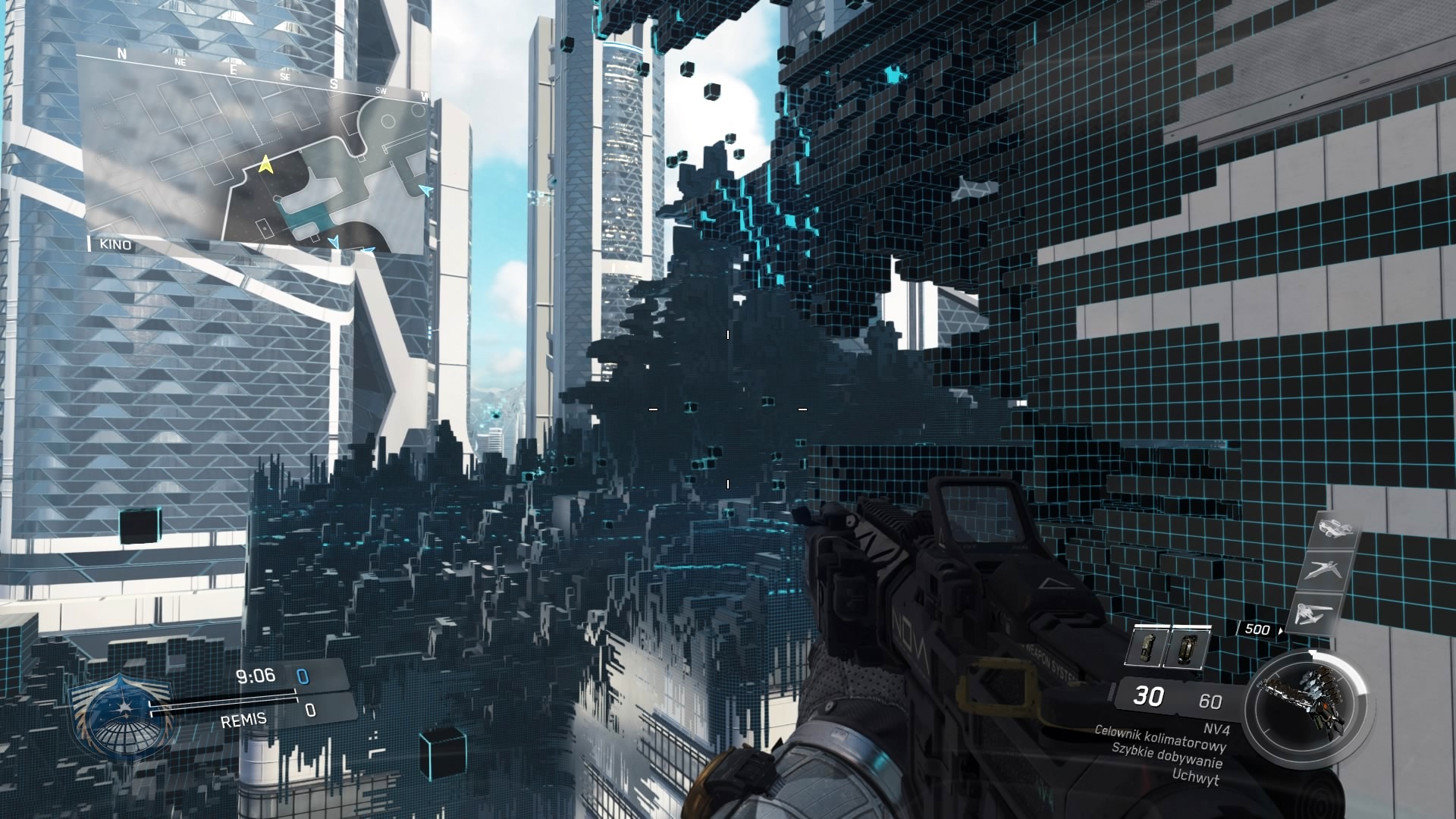 Na koniec pozostawiłem sobie mapę Neon. Podczas wielu godzin gry w dodatek, to właśnie ta była najchętniej wybierana przez graczy, prawdopodobnie dlatego, że jest najbardziej uniwersalna. Stworzona została na kształt litery Z i ma sporo miejsc, w których można oflankować przeciwnika. W Neon nie brakuje też otwartych przestrzeni, ale z kolei nie takich jak to ma miejsce w Dominion. Jest to też jedna z tych map, która pokazuje futurystyczny klimat Infinite Warfare – miasto przyszłości zaprezentowane w Neon w niczym nie przypomina współczesnych miejsc. Ciekawym zabiegiem stylistycznym okazuje się zaprojektowanie celowych błędów występujących na mapie. Tak jakby cała mapa była niedokończona. Czasami auto nagle zniknie, aby pojawić się nieco dalej, totalnie psując strategiczne szyki. Innym razem zobaczymy, jak ściana się doczytuje – oczywiście w charakterystyczny dla komputerowego renderowania sposób. Natomiast po zabiciu przeciwnika, ten zamienia się w kupkę pikseli i znika.