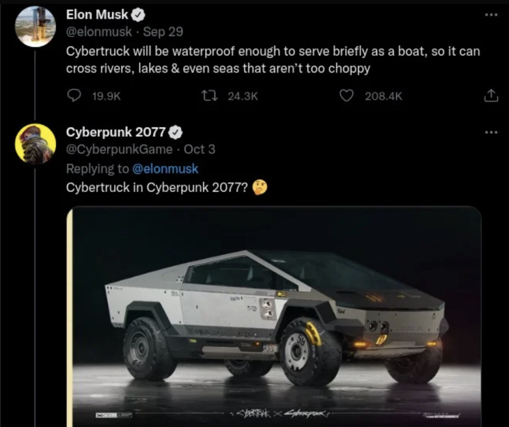 Tymczasem jak to na CD Projekt przystało, potrafią oni zrobić wokół siebie szum. I tak na przykład podpięli się dwa dni temu pod post Elona Muska na Twitterze. Miliardem napisał w nim kilka informacji na temat Cybertruck – sporej wielkości pojazdu elektrycznego, który ma zamiar wyprodukować. Jak twierdzi Musk, pojazd ten może przemierzać rzeki i jest wodoodporny. Oczywiście w przypadku wody, nie może być ona zbyt głęboka.