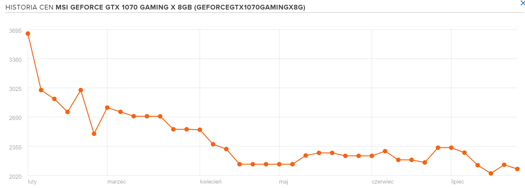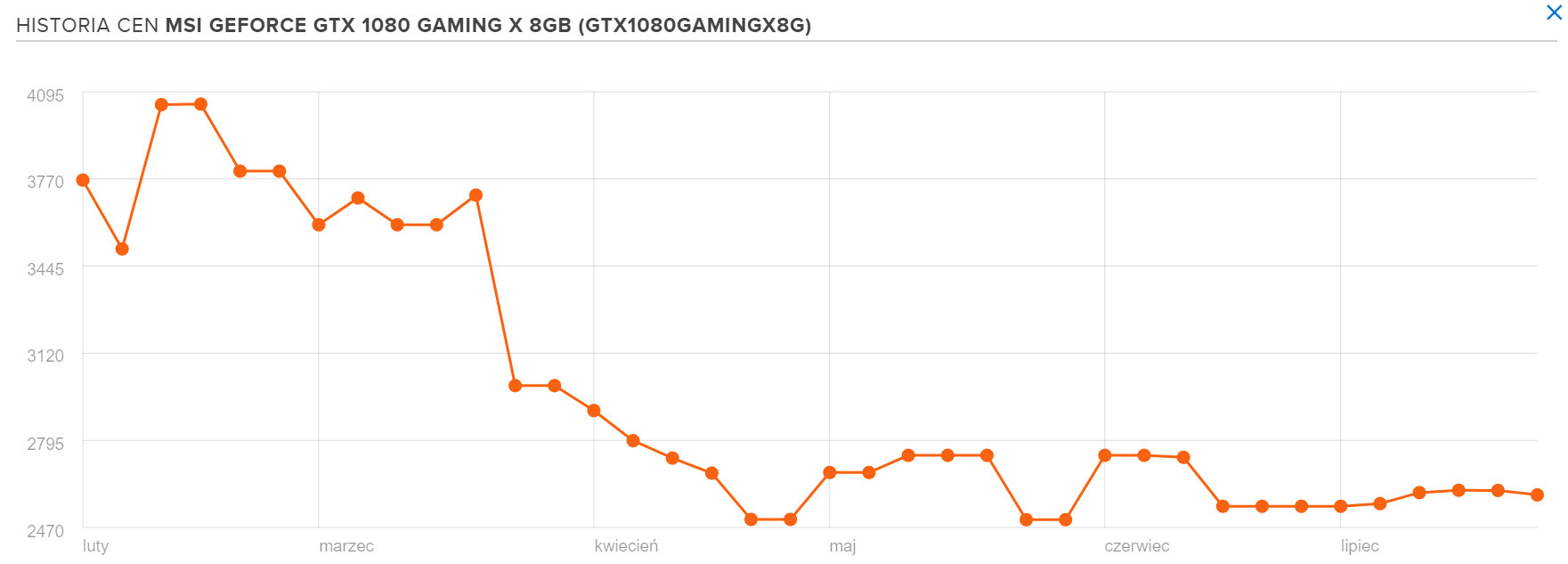 Idziemy dalej i sprawdzamy model GeForce GTX 1070. Aby mieć dobre porównanie z poprzednim przykładem, odnieśmy się do tego samego sklepu i po raz kolejny zerknijmy na x-kom. W wymienionym miejscu za model MSI GeForce GTX 1070 Gaming X 8GB zapłacimy 2371 zł (po raz kolejny MSI jest najpopularniejszym wyborem wśród użytkowników Ceneo.pl). I tutaj uwaga. W lutym tego roku tę samą kartę wyceniono na 3649 zł! Chociaż jak pokazują wykresy, cena tydzień temu oscylowała nawet w granicach 2049 zł. Poszła więc nieco w górę, ale nadal jest dużo bardziej atrakcyjniejsza niż pół roku temu. Warto przy tym zaznaczyć, że GeForce GTX 1070 można kupić taniej, o ile zdecydujemy się na model innego producenta. Za poniżej 1900 zł można kupić wersję od firmy Zotac.