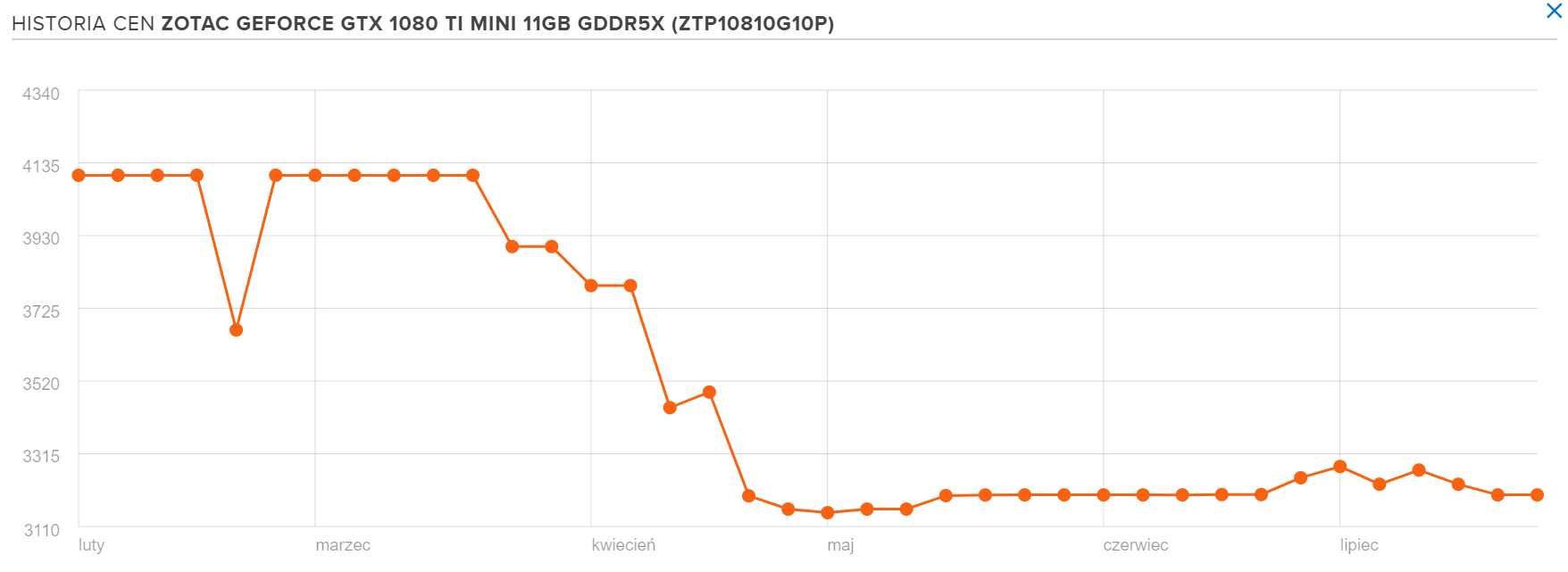 Na koniec pozostawiłem pewną ciekawostkę i wziąłem na tapetę jeden z topowych modeli marki NVIDIA, a mianowicie GTX 1080 Ti, ale od Zotac. Wyobraźcie sobie, że na początku marca trzeba było zapłacić za niego 4100 zł! Pod koniec kwietnia zaczęły się drastyczne spadki. Teraz według Ceneo.pl, cena unormowała się na poziomie około 3269 zł – za tyle można zgarnąć tę kartę w x-kom.