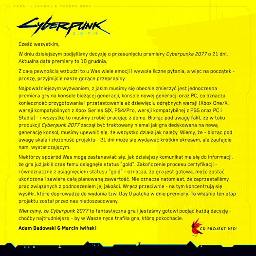 Przed rozprzestrzenieniem się koronawirusa studia deweloperskie prawdopodobnie otrzymały informację o zbliżonej dacie premiery nowych konsol. Zgaduje więc, że pierwotnie miały się pojawić w okolicach pierwszej daty premiery CP 2077, czyli w kwietniu. Stan wyjątkowy mógł zmusić Sony i Microsoft do wybrania innego terminu, co z pewnością wpłynęło na to, że i Redzi zmienili swoje plany aż trzykrotnie, czekając na decyzje obu producentów.