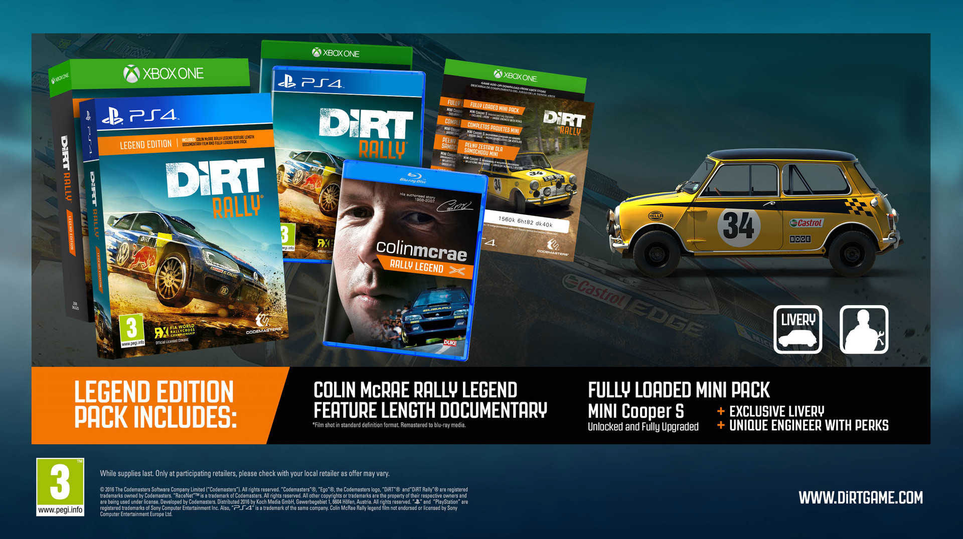 Zwłaszcza, jeśli jesteście wielkimi fanami legendy, jaką niewątpliwie jest Colin McRae. Codemasters zapowiedziało bowiem, że edycja day one DiRT Rally na PlayStation 4 oraz Xboksa One – nazwana Legend Edition – będzie zawierała trwający 90 minut film dokumentalny o wspomnianym kierowcy na dysku Blu-ray. Dodatkowo w pudełeczku znajdziemy Pełny zestaw dla samochodu Mini.