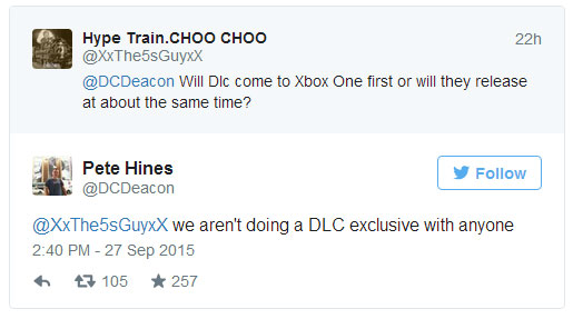 Wynika tak z odpowiedzi, jakiej Pete Hines udzielił na pytanie jednego z graczy, który chciał się dowiedzieć, czy dodatki do czwartego Fallouta nie pojawią się czasem w pierwszej kolejności na XOne. - Nie robimy ekskluzywnych DLC dla nikogo - zaznaczył deweloper.