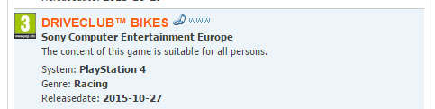 Na stronie PEGI pojawił się wpis do tytułu DriveClub Bikes (już go tam nie znajdziecie, lecz poniżej wrzucamy PrtSc). Ze skromnego opisu wynika, że będzie to gra przeznaczona dla osób od 3. roku życia i pojawi się wyłącznie na PlayStation 4. Wydawcą ma być natomiast Sony.