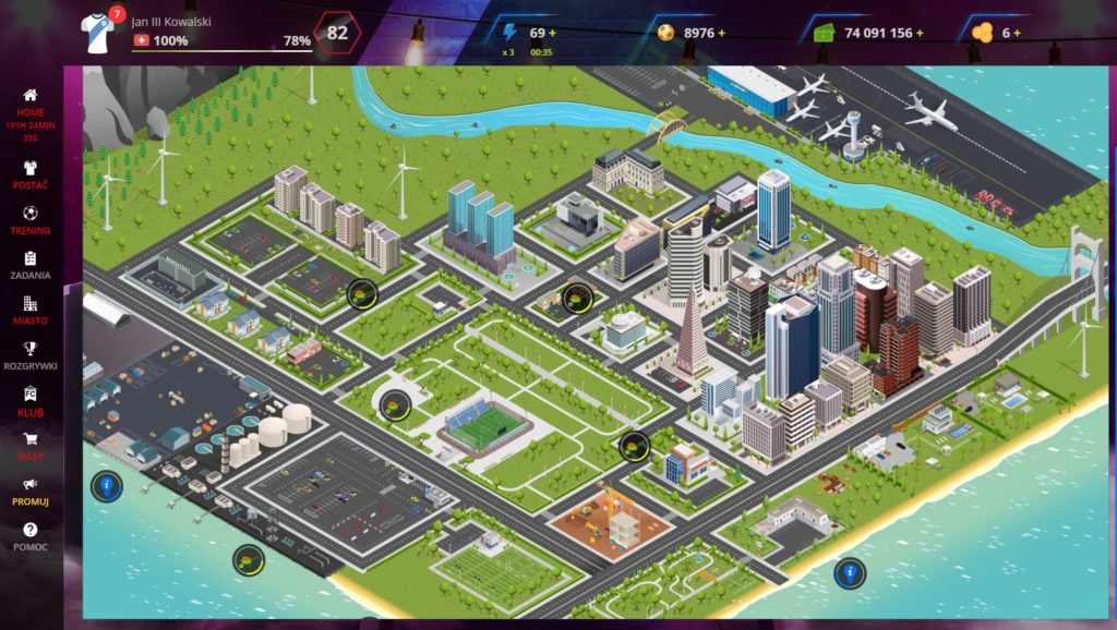 Do tej pory moduł Klubowy był nienagannie funkcjonalny, jednak jak się okazało – można go było uczynić jeszcze lepszym. Pisząc „lepszym” mam na myśli „jeszcze bardziej rozbudowanym” oraz „jeszcze bardziej immersyjnym”. Nieocenionej immersji dodała grze kolejna nowość. Nowość związana z udźwiękowieniem gry, jednak o tej kwestii napiszę więcej już w kolejnych akapitach. Tymczasem wróćmy do sekcji Klub. Zacznijmy od tego, że gra oddaje nam teraz do dyspozycji czytelną mapkę miasta, na której znajdują się poszczególne (nowe!) budynki, takie jak budynek klubowy, hotel, parking, stadion czy nawet księgowość naszego klubu. Z poziomu tej mapki możemy szybko podejrzeć np. na jakim poziomie rozbudowy jest dany obiekt, przy czym takie rozbudowy wpływają oczywiście pozytywnie na nasz zespół (np. na liczbę sprzedanych biletów na mecz czy na dochody w związku z liczbą noclegów w hotelu).