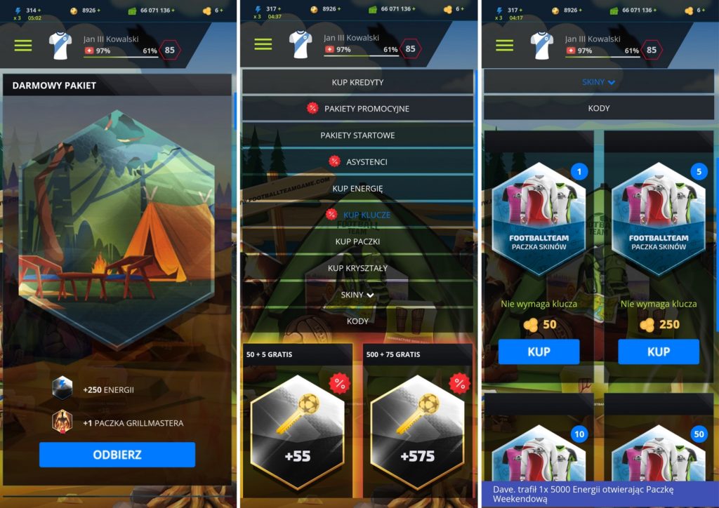 Jak na każdego szanującego się menedżera sportowego przystało, tak samo i w FootballTeam nie ma miejsca na bezmyślne klikanie w kolejne menusy interfejsu. Trzeba tu przede wszystkim sporo główkować, by stworzony przez nas zawodnik dobrze pożytkował czas oraz pieniądze. Tak samo, jak w innych tego typu przeglądarkowych grach, całość polega bowiem na żonglowaniu kilkoma zasobami w możliwie przemyślany sposób. Te zasoby to nie tylko pieniądze liczone w euro, ale także Złote Piłki oraz Punkty Energii. Są też Kredyty, które kupujemy m.in. za prawdziwe pieniądze, ale nie są one niezbędne, by cieszyć się pełnią gry. Jakby jednak nie było, ich nabycie ma na celu przyspieszenie rozwoju naszego podopiecznego. Jest jednak dobra wiadomość: Kredyty można wygrać także we wspomnianych już pojedynkach na tricki, sprzedając przedmioty z gry na wewnętrznym rynku czy w końcu zapraszając znajomych do gry w systemie poleceń (gdy ten kupi Kredyty, Ty otrzymasz 10% ich wartości).