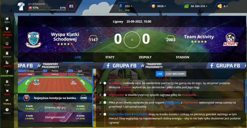 Gdy nasza praca i treningi wywindują nas w końcu na wystarczająco wysoki poziom postaci (OVR), będziemy mogli samodzielnie założyć klub piłkarski, czy to ze znajomymi, czy też z innymi graczami, których zapoznamy na dedykowanej grze facebookowej grupie (klik), bądź na czacie dla graczy (znajdziemy go w podmenu gry o nazwie Miasto). Inną opcją jest dołączenie się do istniejącego już zespołu. Co ciekawe, w menu gry związanym z naszym klubem znajduje się także klubowy czat, dzięki czemu możemy łatwo komunikować się z pozostałymi graczami z naszej drużyny. Nie tylko umawiać się na najbliższe grupowe treningi, sparingi czy mecze, ale także nawiązywać znajomości.
