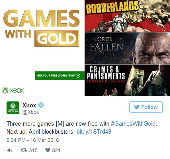 Przy okazji wspomniano, że oferta Games With Gold na kwiecień 2016 będzie wypełniona blockbusterami, czyli przebojami, które w przeszłości nieźle się sprzedały. Ciekawe, czy to tylko zwykły chwyt marketingowy, czy rzeczywiście kwietniowa lista zaskoczy nas czymś wyjątkowym. Może kolejny wielki tytuł AAA, a oprócz tego jakieś indyki, tyle że naprawdę dobrego sortu? Czekamy z jeszcze większą niecierpliwością na ujawnienie nowego GwG!