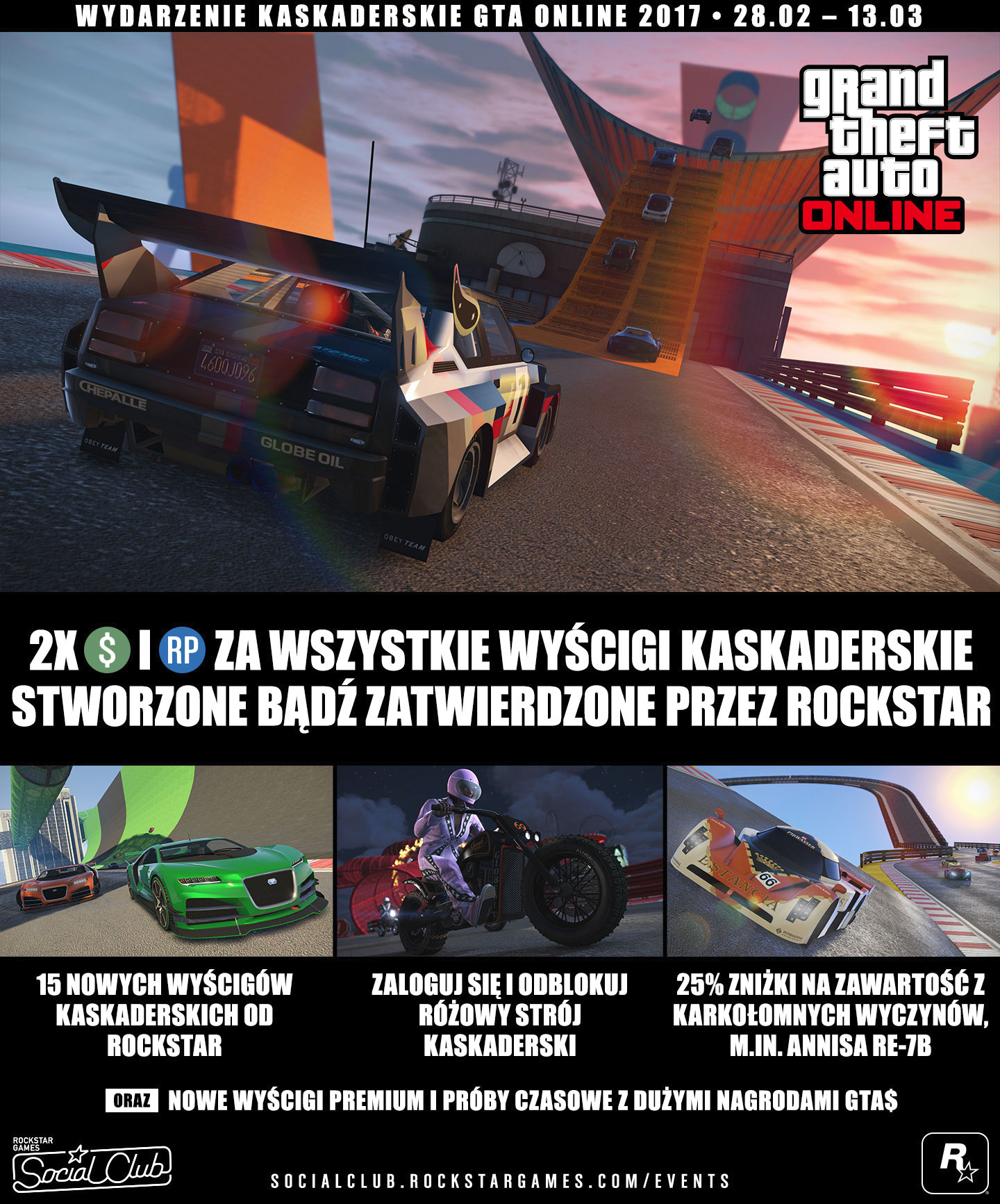 Tym razem coś dla kaskaderów! Od dwóch dni możemy korzystać z nowych atrakcji, które przygotowali dla nas deweloperzy. Chodzi o Wydarzenie kaskaderskie, wprowadzające 15 nowych wyścigów kaskaderskich stworzonych bądź zatwierdzonych przez Rockstar, które zapewnią podwójne premie GTA$ i RP. Dla wszystkich graczy czeka bonus za samo zalogowania się do GTA Online – różowy strój kaskaderski Jocka Cranleya. Żeby go zgarnąć, należy zajrzeć do Los Santos do dnia 13 marca.