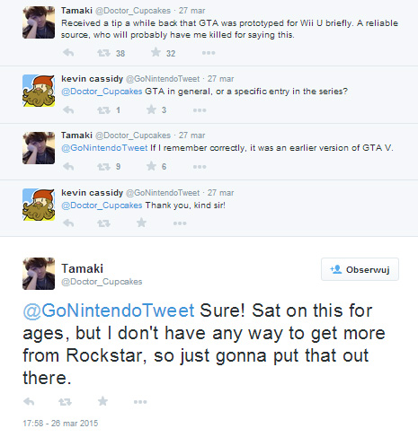 Jej autorem jest Liam Robertson z serwisu Unseen 64, który nazywa siebie odkrywcą zaginionych i niewidzialnych gier wideo. Według niego wczesna wersja GTA V była testowana na konsoli Nintendo, lecz Rockstar ostatecznie zrezygnował z tej platformy. Jak pisze Robertson na swoim profilu w serwisie Twitter (PrtSc poniżej), informacja pochodzi z wiarygodnego źródła, które prawdopodobnie zabije go za te słowa.