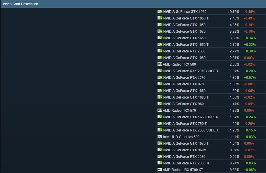 Głos rozsądku okazał się decydujący w kwestii zakupu 1. gen. RTX. Nie było sensu inwestować w nową technologię, skoro nie była ona dobrze zoptymalizowana. Więc gros użytkowników zostało przy swoich starych zestawach. GTX 1050, GTX 1050 Ti, GTX 1060, GTX 1070 wciąż wiodły prym w klasyfikacji kart graficznych, a nawet zyskały nowych zwolenników. Dlaczego? Bo oferowały najlepszy stosunek ceny do osiągów. Były tanie i dobre do grania w rozdzielczości Full HD. Aż do teraz najpopularniejszym układem graficznym pozostał GTX 1060 – korzysta z niego prawie 11% wszystkich użytkowników Steam.