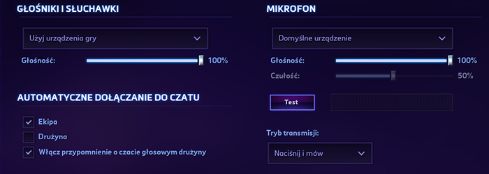 Jeśli zagłębicie się w bardziej zaawansowane ustawienia czatu głosowego i skorzystacie z rozwijanych menu u góry ekranu, możecie np. wybrać urządzenie, z którego dobiegać będą głosy waszych sojuszników oraz wskazać preferowany przez siebie mikrofon. Możecie nawet kliknąć przycisk „Test”, aby usłyszeć, jak będziecie brzmieć w słuchawkach pozostałych członków drużyny w czasie meczu. A nawet jeśli nie posiadacie mikrofonu, możecie i tak dołączyć do kanałów czatu głosowego ekipy i drużyny, aby przysłuchiwać się tworzonym strategiom i być świadomym podejmowanych decyzji.