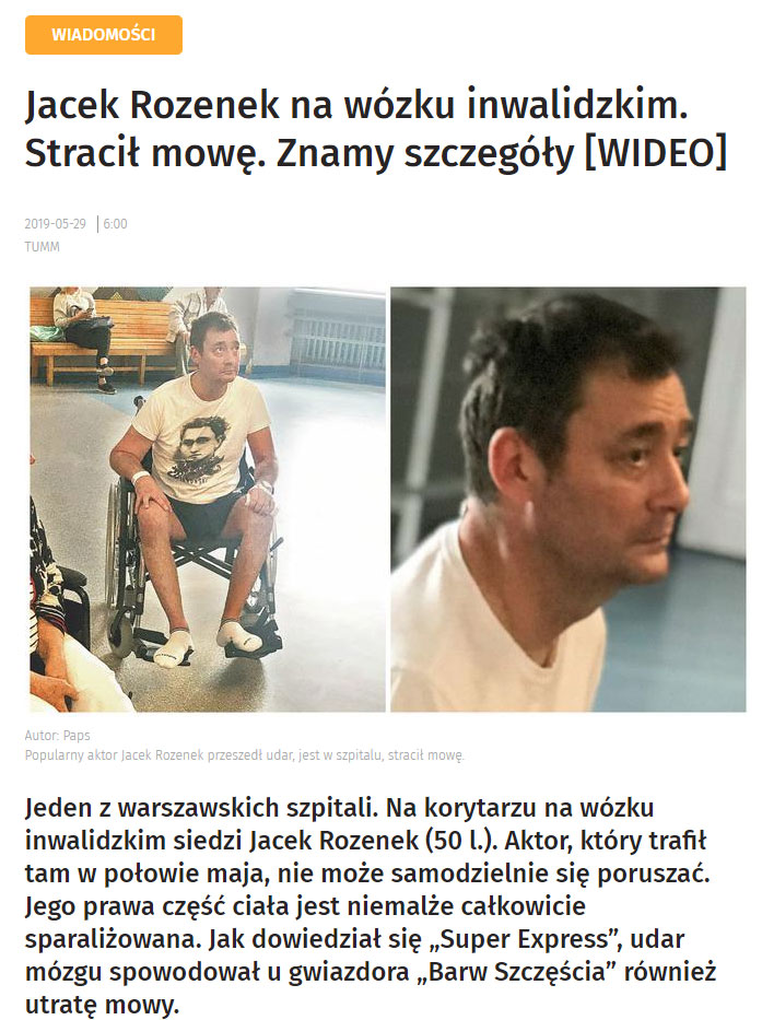 Jacek Rozenek to jedna z postaci, którą kojarzy niemal każdy gracz w Polsce, a to za sprawą Wiedźmina, któremu udzielił głosu. Rozenek to nie tylko aktor głosowy, lecz przede wszystkim teatralny, filmowy oraz telewizyjny. Niestety, Jacek Rozenek przeszedł udar mózgu, w wyniku czego nie może samodzielnie się poruszać. Jego prawa część ciała jest niemalże całkowicie sparaliżowana. Jak dowiedział się Super Express, udar mózgu spowodował u aktora również utratę mowy. Dziennik opublikował zdjęcie Jacka Rozenka ze szpitala, gdzie aktor się obecnie znajduje: