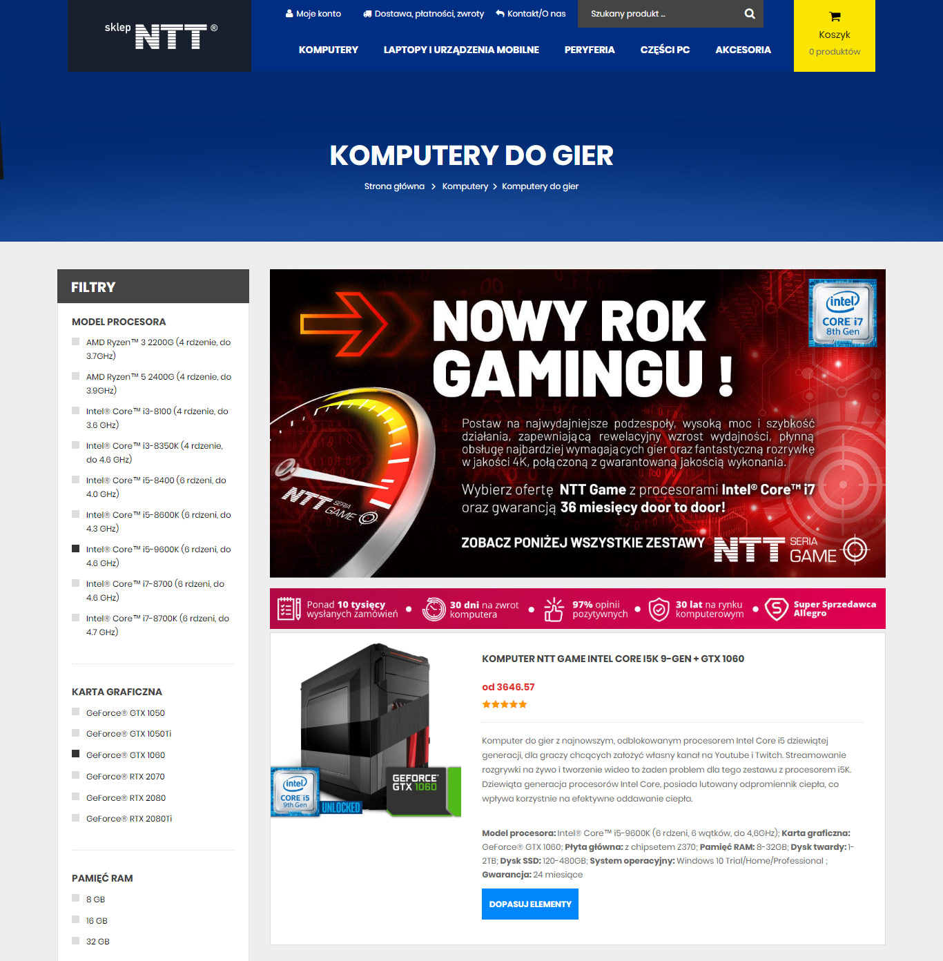 Gracze, którzy nie są obeznani ze składaniem komputera, zazwyczaj wiedzą jedno – jaką kartę graficzną oraz procesor powinien być sercem ich wymarzonego sprzętu. W ofercie NTT znajdziemy jedne z najbardziej wydajnych i najpopularniejszych układów CPU oraz GPU. Wystarczy zajrzeć do zakładki Komputery do gier i skorzystać z filtrów dostępnych w prawej kolumnie strony.