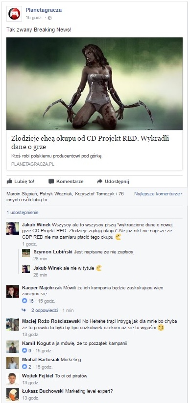 Sieć oczywiście zalała fala artykułów na temat wykradzionych danych i prawie każdy branżowy portal publikował wspomniane oświadczenie polskiej firmy. Redaktorzy zachowują pewien dystans, lecz gracze snują spiskowe teorie (również pod naszym wczorajszym postem na FB, PrtSc poniżej), że żadnego złodziejstwa oraz szantażu nie było, a to co widzimy, to kontrolowany przeciek i początek wielkiej akcji marketingowej dotyczącej gry Cyberpunk 2077.