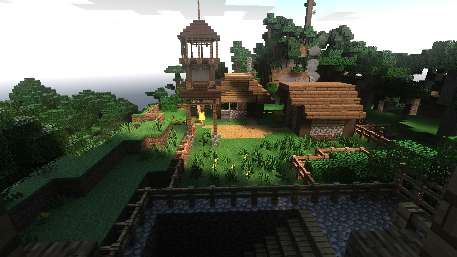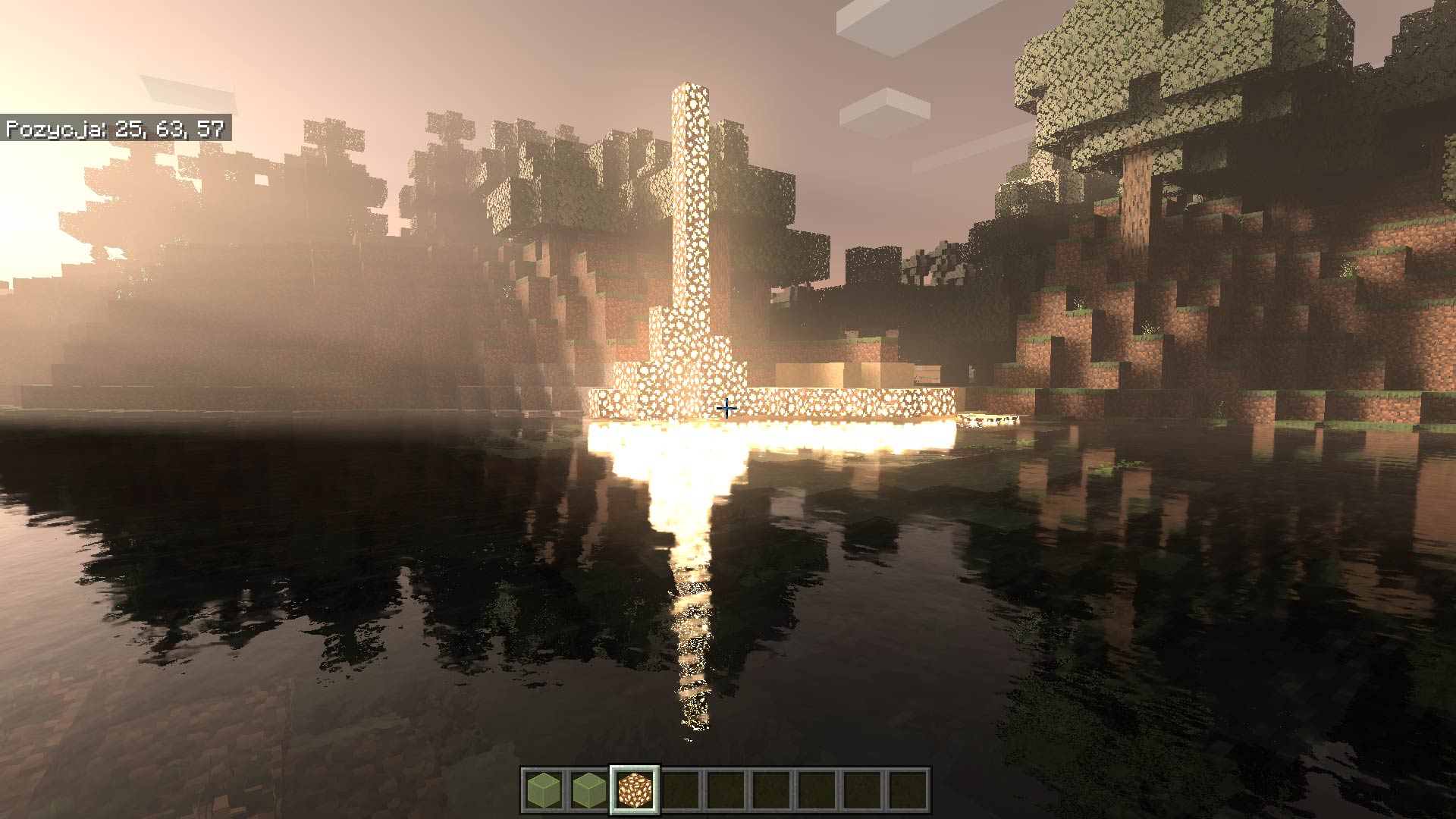 Najwięcej zabawy miałem z jasnogłazem i lawą, czyli elementami emitującymi światło. Po włączeniu ray-tracingu, bloki rozświetlały krystaliczną wodę, rzucały blask na roślinność i wszystko to oczywiście w czasie rzeczywistym. W podziemiach lawa rozświetla mrok, a jeśli postawimy obok niej choćby bloki z kryształem, widzimy, że drobinki kruszcu pięknie lśnią, a czasem nawet odbijają inne elementy otoczenia. Dochodzą do tego wysokiej jakości efekty atmosferyczne – światło przebijające się do wnętrz wygląda fenomenalnie, tak, jak powinno wyglądać w grach obecnej generacji.