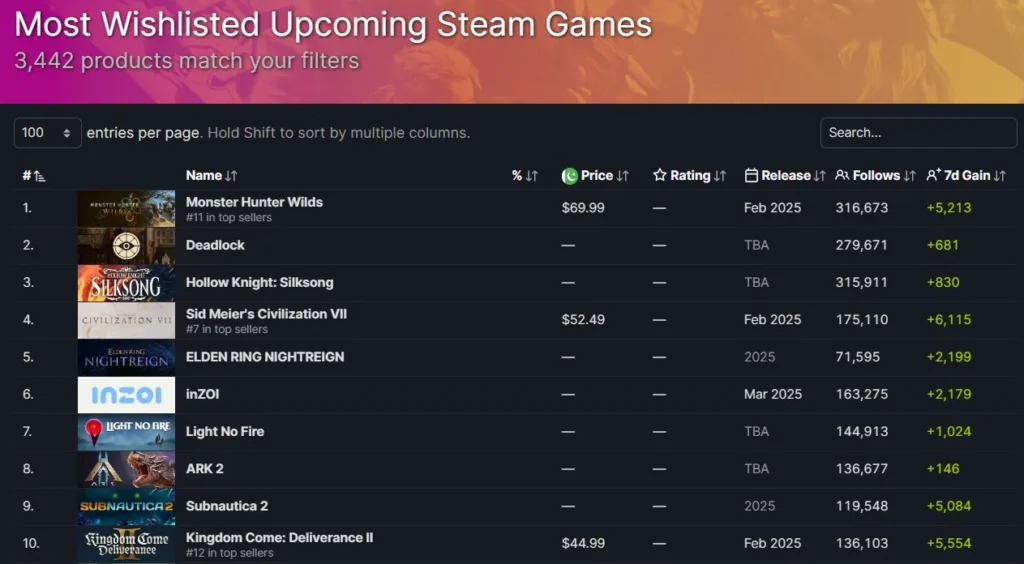 Monster Hunter Wilds ukaże się na PC, PS5 oraz Xbox Series X/S już za niecały miesiąc, bo 28 lutego 2025 roku. I to dopiero dane, których dostarcza serwis SteamDB pokazują, jak duża może to być premiera. W końcu mało której grze udaje się trafić do topki najczęściej dodawanych do list życzeń graczy tytułów na Steam, a wręcz… ją podbić.