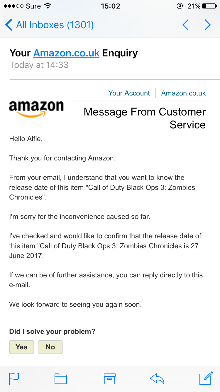 Nie jest jasne czy Zombies Chronicles będzie po prostu zbiorem wszystkich wydanych DLC z zombie do Black Ops III, czy całkowicie czymś nowym. Obstawiamy, że skoro mowa o Chronicles, będziemy mieć do czynienia z tą pierwszą opcją – oczywiście jeśli informacje te będą potwierdzone. Poniżej prezentujemy maila, którego dostał Alfie od Amazona.