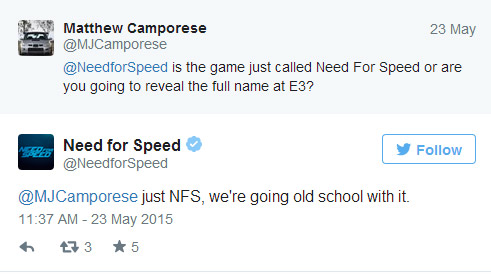 Fani serii zaczęli się zastanawiać, czy wyścigi rzeczywiście będą się nazywać po prostu Need for Speed i nie otrzymają żadnego podtytułu. Niektórzy bowiem twierdzą, że podtytuł istnieje, tyle, że zostanie ujawniony podczas czerwcowych targów E3. Twórcy zaznaczyli jednak na Twitterze, że nic takiego nie będzie miało miejsca, a pełny tytuł nadchodzącej gry to Need for Speed i kropka.