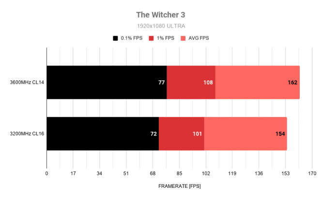 Dodatkowo wykonano test w rozdzielczości Full HD i ustawieniach „ultra”. Tym razem skorzystano z dwóch konfiguracji RAM, aby pokazać różnice pomiędzy 3200 MHz i CL16 a 3600 MHz i CL14. Liczba kl./s była większa w przypadku szybszych modułów RAM – średnio można było liczyć na 162 kl./s, w porównaniu do 154 kl./s.