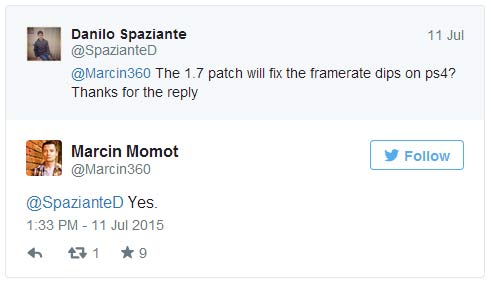 Jeden z graczy zapytał wobec tego w serwisie Twitter, czy nadchodząca aktualizacja naprawi również problem spadków płynności w przypadku Wiedźmina 3: Dziki Gon na PlayStation 4. Marcin Momot odpowiada krótko i konkretnie: Tak.