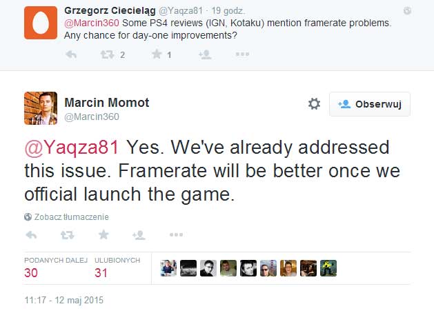 Jeden z użytkowników serwisu Twitter zapytał o tę kwestię polskiego dewelopera. Czy patch w dniu premiery Dzikiego Gonu podciągnie fps-y?