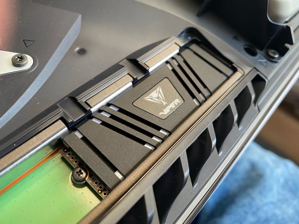 Dysk po wyjęciu z opakowania sprawia wrażenie bardzo solidnego. Na górze znajdziemy niskoprofilowy radiator i to akurat bardzo dobra informacja. Dlaczego? Dzięki takiej konstrukcji dysk znajdzie zastosowanie nie tylko w PC, ale także w PlayStation 5, co sprawdziliśmy. Górna część wygląda bardzo stylowo, zwłaszcza w połączeniu z paskami LED, które podświetlają rowki dysku. Na środku znajdziemy z kolei logo marki Viper, które również możemy podświetlić.