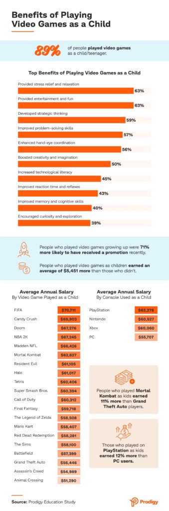 Okazało się, że większość rodziców (95%) pozwalała swoim dzieciom grać w gry wideo. Wielu rodziców dostrzegło konkretne korzyści: 53% uważało, że gry wideo poprawiły umiejętności rozwiązywania problemów ich dzieci, podczas gdy 48% uważało, że gry stymulowały kreatywność. Nasze badanie wykazało pozytywną korelację między grami a wynikami w nauce: 48% dzieci, którym pozwolono grać w gry wideo, uzyskało doskonałe oceny (A lub równoważne), a 38% utrzymało dobre oceny (B lub równoważne).