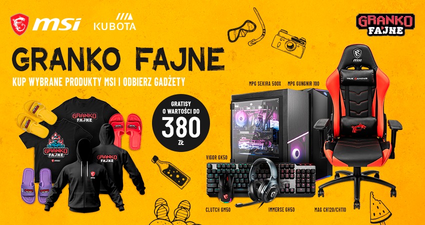 Na koniec zostawiliśmy najlepsze! Od dziś do 7 czerwca trwa akcja promocyjna, dzięki czemu zgarnąć można kilka fajnych gratisów. Kupując gamingowy fotel, obudowę Sekira lub dowolny zestaw składający się ze słuchawek, klawiatury i myszki, dostaniecie bluzę Grankow Fajne, koszulkę i klapki Kubota! Koszulkę i klapki można też zgarnąć zakupując akcesoria takie jak klawiatura MSI GK50 i słuchawki GH50 omawiane w tekście. Rzućcie okiem na szczegółową tabelę gratisów poniżej, a więcej informacji znajdziecie tutaj.
