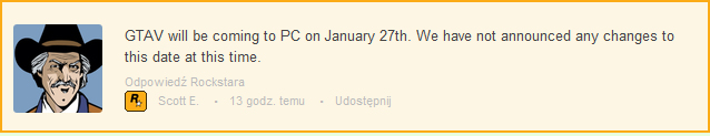 Na szczęście Rockstar bardzo szybko ucina plotkę. Na forum dewelopera padło pytanie: Czy GTA V na PC zostało przesunięte? Producent odpowiada: GTA V na PC pojawi się 27 stycznia. Nie ogłosiliśmy żadnych zmian w związku z tym terminem.