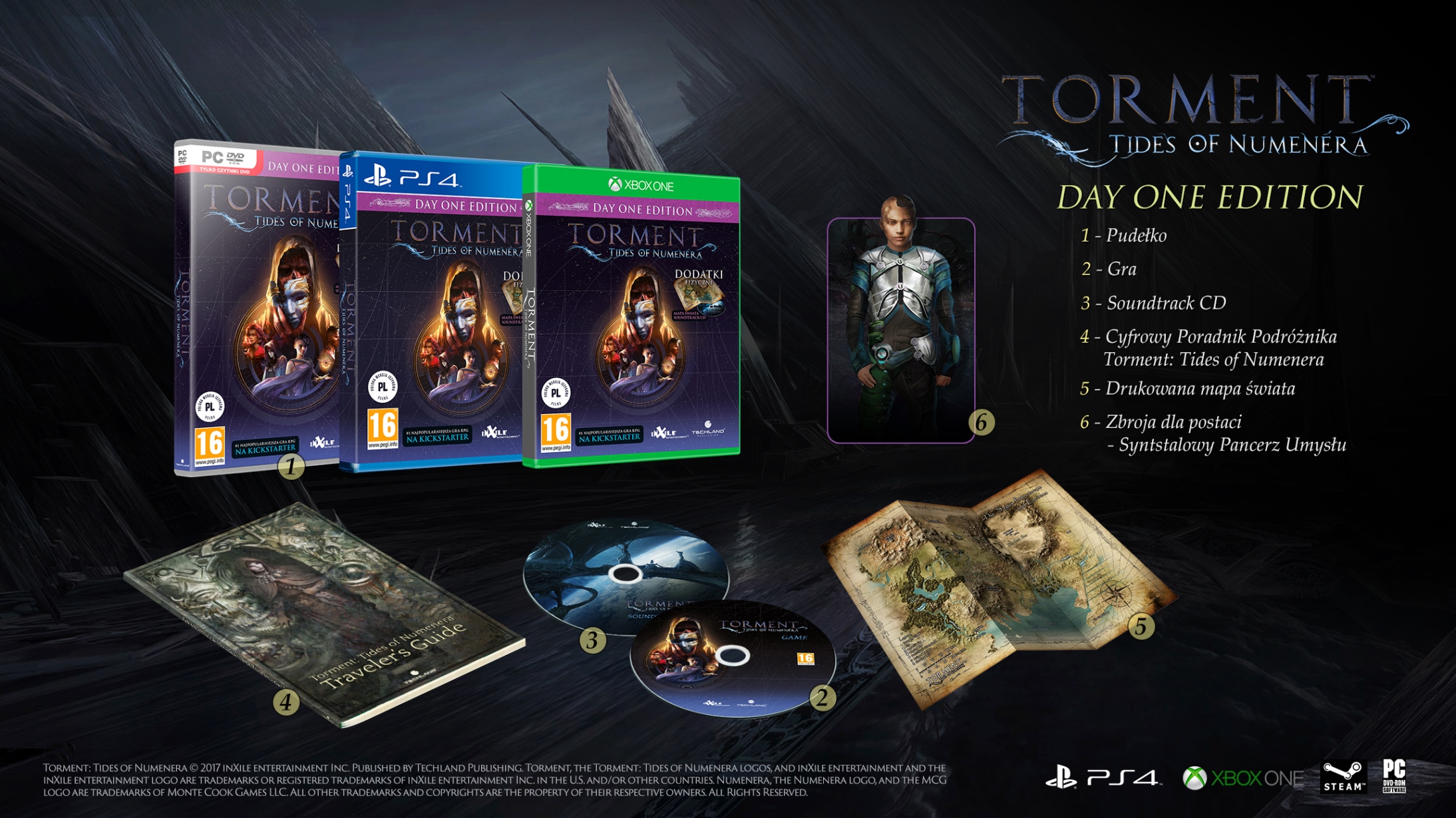Torment: Tides of Numenera dostępny będzie w cenie 159,90 zł na PC oraz 199,90 zł na konsolach. Można już składać zamówienia przedpremierowe na Day One Edition, Edycję Kolekcjonerską (399 zł) i cyfrową Digital Deluxe Edition. Osoby decydujące się na wcześniejsze zamówienie Day One Edition otrzymają ekskluzywnego, limitowanego steelbooka. Więcej informacji na temat zawartości Edycji Kolekcjonerskiej oraz bonusów do zamówień przedpremierowych w oficjalnym zwiastunie.