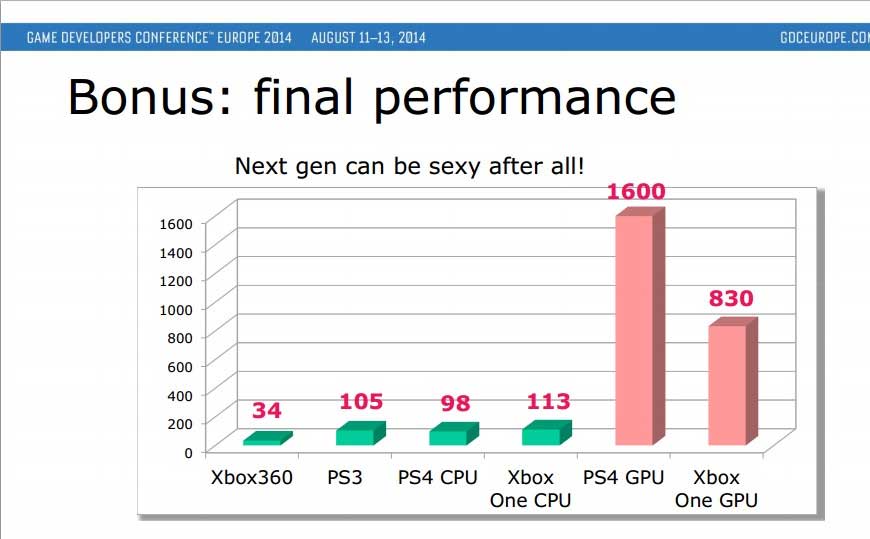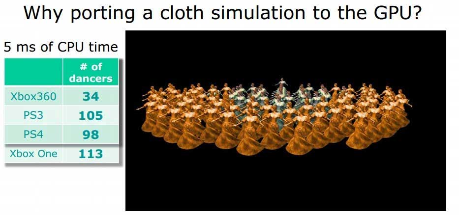 Dlaczego twórcy zastanawiają się w ogóle nad odciążeniem CPU kosztem GPU? Powód jest prosty. Procesory na płycie głównej obu konsol nowej generacji są dla Ubisoftu za słabe. Jak możecie zobaczyć na poniższej grafice, nawet PlayStation 3 wyciska z Motion Cloth więcej niż PS4.