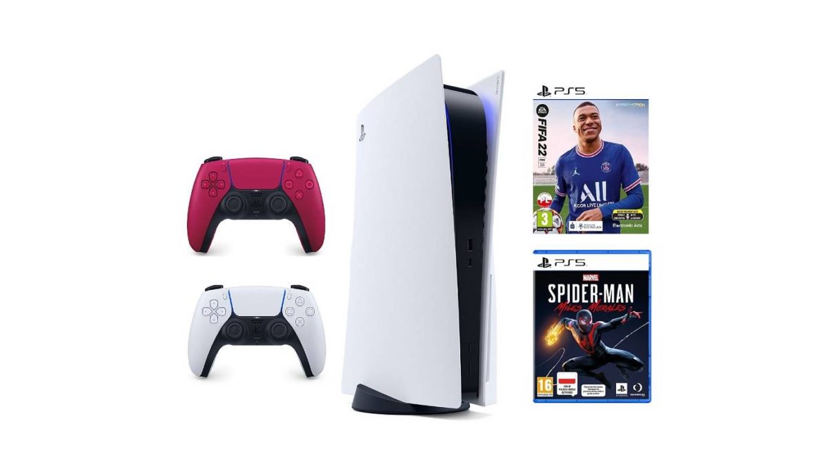 - Konsola SONY PlayStation 5 + Kontroler DualSense Czerwony + FIFA 22 + Miles Morales – 3349 zł