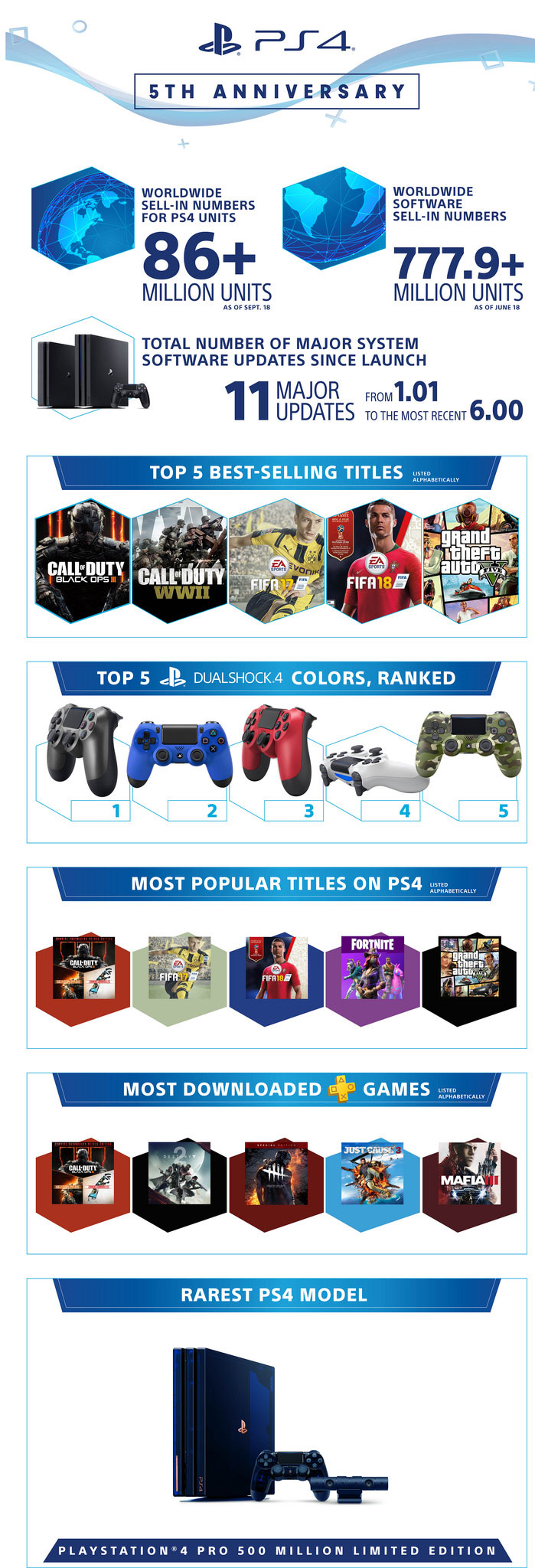 PS4 kończy dzisiaj 5 lat, zatem to dobry czas na szybkie podsumowanie dorobku sprzętu. Sony wypuściło z tej okazji infografikę.