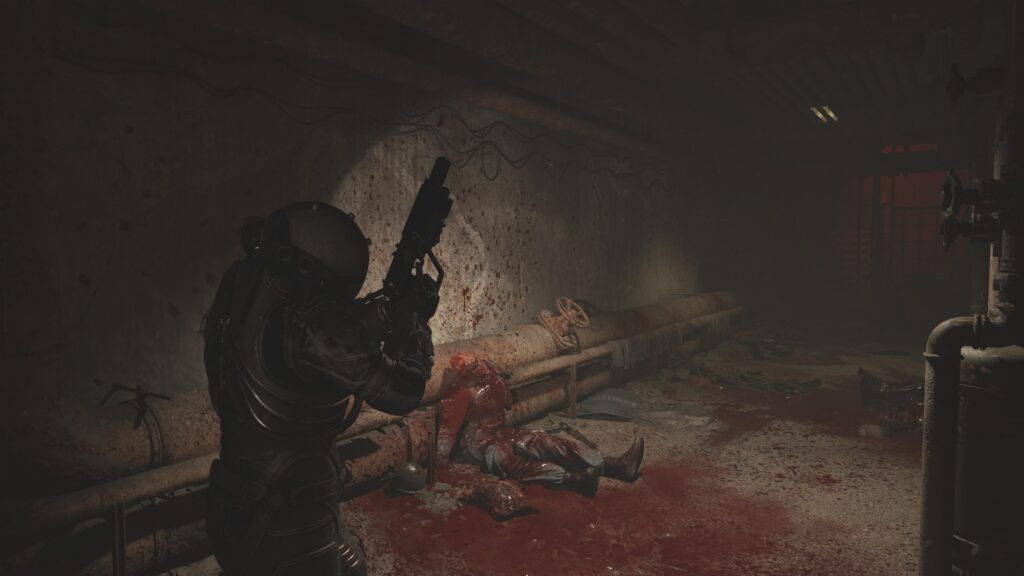 Klasycznie oprócz samych pukawek i dwóch rodzajów ciosów wręcz, mamy kilka innych form pomocy. Jak na przykład wspomniane już spalanie ciał wrogów, czego dokonać możemy na odległość albo w zwarciu. Znajdziemy też wspomagacz do pukawki, jak choćby małą diodę pokazującą punkty życia wroga. Świetna rzecz, dzięki której możemy przed wejściem do danej lokacji sprawdzić, które z walających się pod nagi trucheł zechcą zaraz na nas skoczyć. Dużą pomoc może stanowić ulepszanie wyposażenia, czy to broni, innych form eksterminacji wrogów albo właśnie kombinezonu. Bodaj najbardziej charakterystyczny element całej gry – kombinezon głównej bohaterki z dziwacznym i intrygującym hełmem – nie jest na starcie szczególnie mocny.