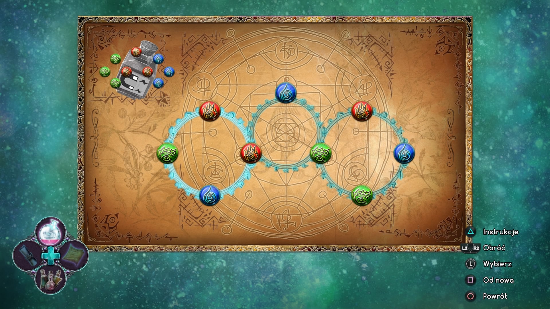 Jak przystało na młodą, ambitną alchemiczkę, przyjdzie nam tworzyć szereg eliksirów z zebranych składników. Jest to ciekawy patent, który w pewien sposób urozmaica rozgrywkę. Przyrządzenie danego wywaru związane jest z mini-grą. Dostajemy oto kilka nachodzących się na siebie okręgów, na których znajdują się symbole z żywiołami, a naszym zadaniem jest ułożenie wzoru według podanego schematu.