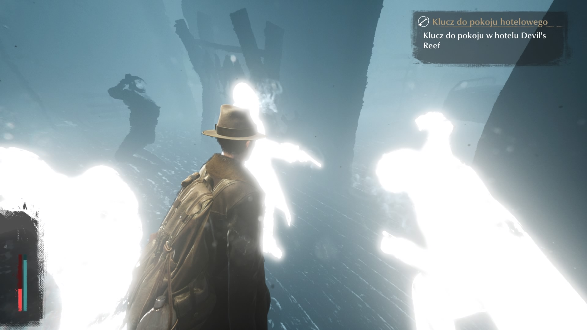 W nieco opuszczonych rejonach mogą nas atakować pajęczaki jakby żywcem wyjęte z Dead Space. Dużo groźniejsze humanoidy przypominają zaś „klikaczy” z The Last of Us. Są też wężo-ludzie czyhający na nas w wodzie, którzy… a z resztą nie będę wam więcej zdradzał, bo nawiązań jest cała masa. Gdy już jednak staniemy twarzą w twarz z bestiami, nasz bohater wpada w panikę. Niebieski pasek, znajdujący się obok czerwonego z życiem, napełnia się, a wraz z nim świat wokół nas zmienia się, ciemnieje i dalsza walka staje się beznadziejną próbą przetrwania. Na pokonanie obłędu jest jednak szansa – wystarczy oddalić się z miejsca opanowanego przez potwory i przeczekać, lub wziąć leki na uspokojenie. Podczas wchodzenia do nieznanych obiektów warto pamiętać o ładowaniu broni, ponieważ bohater nie robi tego automatycznie. Gapiostwo może słono kosztować!