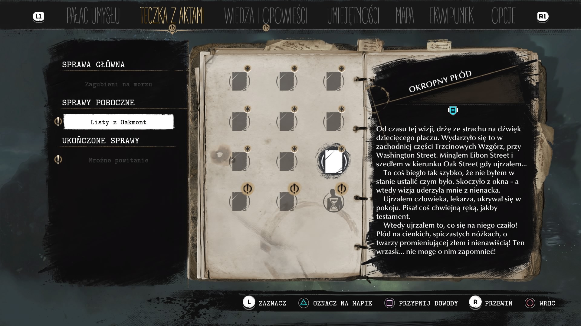 W grze mamy kilka istotnych zakładek, które pomagają nam w układaniu pewnych wątków w logiczną całość. Najważniejszy w tym jest Pałac Umysłu, który służy do łączenia poszlak za pomocą kafelków z zeznaniami. Gdy skompletujemy kilka informacji, możemy je ułożyć w odpowiedniej kolejności i zyskać dowód w danej sprawie. Teczka z Aktami zawiera wszelkie zapiski, w tym jakże ciekawe listy. Historyjki z lekarzem, na którego czai się płód na cienkich szpiczastych nóżkach czy opis pogańskich obrzędów Innsmouthczyków mocno zaabsorbowały moją uwagę. Wiedza i Opowieści to zbiór notatek, opowieści, korespondencji, dokumentów i mitów o Oakmont. Mapa daje nam ogląd na całe miasto. To na niej możemy przypinać dowody czy zaznaczać miejsca, do których wyruszymy. Jest też zakładka Bestariusz, który sam w sobie potęguje ciekawość świata gry, przedstawiając informacje o przeciwnikach. Ekwipunek daje nam możliwość sprawdzenia dostępnego wyposażenia – broni, materiałów wybuchowych czy medykamentów. Umiejętności z kolei to nic innego, jak opcje rozwoju naszego detektywa. Tak, The Sinking City ma znamiona RPG! Za zabicie każdej maszkary czy znalezienia dowodu dostajemy punkty doświadczenia. Oczywiście nie ma tu przesadnego szaleństwa ze stopniem rozwoju sprawności bojowej Reeda, jego żywotności czy umysłu, ale warto docenić ten aspekt i dbać o niego. Nasz bohater to tylko krucha ludzka istota, która często musi stawiać czoła istotom nie z tego świata…