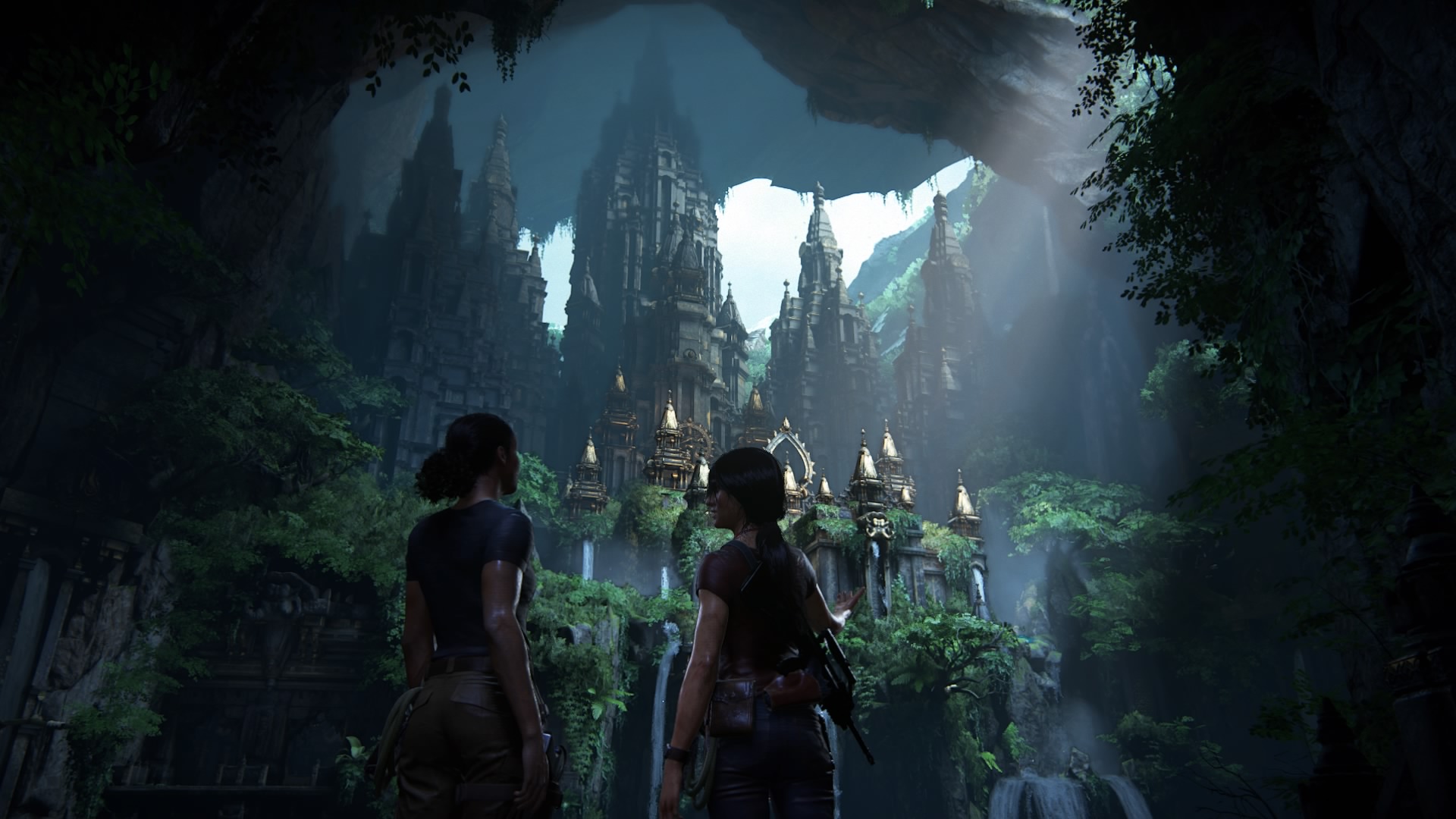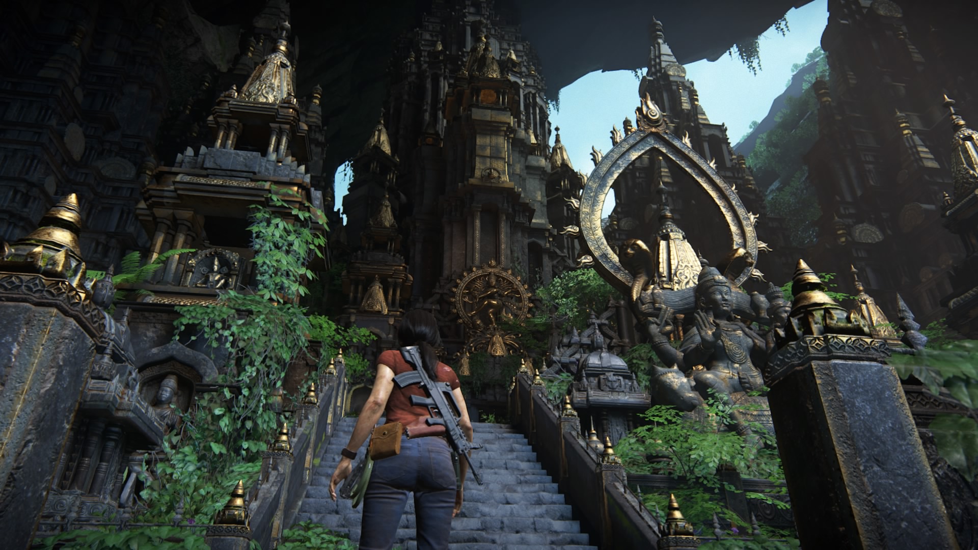 Później natomiast zapuszczamy się w zapomniane przez ludzkość miejsca, czyli do pozostałości Imperium Hojsalów, z okazałymi miastami, gargantuicznymi statuami hinduskich bóstw oraz gęstymi lasami pełnymi małp i słoni (możemy jednego uratować i się na nim przejechać!). W Uncharted 4 dużym powiewem świeżości był Madagaskar o otwartej strukturze, gdzie za kierownicą terenówki pochłanialiśmy kolejne połacie dzikich terenów, szukając tropu do skarbu Henry’ego Avery’ego. W Zaginionym dziedzictwie takim odpowiednikiem, w dodatku większym – warto dodać, są Ghaty Zachodnie. Znajduje się tam wiele świątyń, ukrytych znajdziek oraz tokenów, które można opcjonalnie zbierać, aby otworzyć pewien skarbiec.
