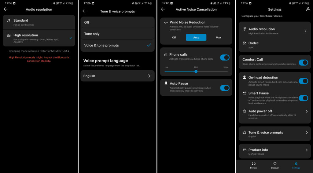 Słuchawkom towarzyszy aplikacja mobilna o nazwie Sennheiser Smart Control. Po sparowaniu smartfona ze słuchawkami przez Bluetooth, aplikacja będzie pokazywać nam np. ile jeszcze pozostało nam baterii. Aplikacja to także szansa na przygotowanie własnych presetów brzmieniowych (equalizera), możliwość zaktualizowania oprogramowania, aktywacji czujników zbliżeniowych i nie tylko. W apce znajdziemy także opcje, dzięki której dostosujemy działanie ANC i tryby transparentnego, a także ustawimy, w jakich obszarach będą aktywowały się poszczególne ustawienia słuchawek (np. po wyjściu z domu może włączać się automatycznie tryb przezroczystości). Jako że ustawień jest naprawdę sporo, ze wszystkimi możecie zapoznać się samodzielnie, zerkając na poniższe screenshoty z aplikacji: