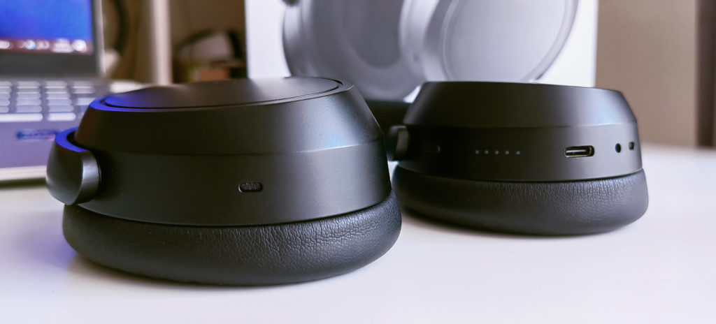 Słuchawki utrzymane są w czerniach i szarościach. Do ich wykonania użyto z kolei tworzywa (plastikowe widelce, zewnętrzne części klap), mocnego materiału tekstylnego (obszycie zewnętrznej części płąka) oraz skóry (poduchy klap i wewnętrzna część pałąka). Całość jawi się więc bardzo klasycznie i elegancko, połyskując z obu stron srebrnym ogotypem producenta. Taki, a nie inny design słuchawek sprawia, że pasują one do każdego ubrania – bardziej sportowego, jak i eleganckiego. Urządzenie wyposażone zostało łącznie z 4 mikrofony – po dwa do rozmów i po dwa dla systemu ANC. Maskownicę jednego z nich znajdziecie na krawędzi lewej klapy. Na prawej klapie dzieje się już dużo więcej ciekawych rzeczy. Oprócz maskownicy drugiego mikrofonu znajdziemy tu także złącze ładowania USB-C, złącze 3,5 mm jack, diody powiadomień (pokazują poziom baterii, stan parowania, itd.) oraz przycisk asystenta głosowego.