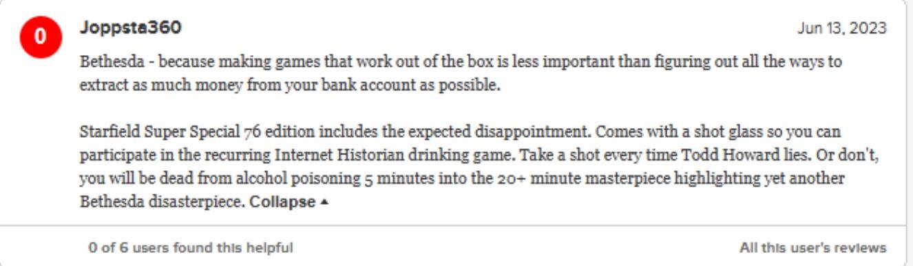 Pojęcia nie mamy. Starfield ma ukazać się dopiero 6 września 2023 roku, a na Metacriticu niemal dosłownie przed chwilą pojawiła się wspomniana negatywna opinia. Serwis nie pozwala na wystawianie grom opinii przed premierą (a i po będzie trzeba trochę odczekać), więc najpewniej musiało dojść do jakiegoś błędu. Z racji anonimowości, jaką gwarantuje serwis, nie wiemy, kim ten internauta jest. Niedawno wystawił on Diablo IV inną negatywną recenzję, hejtując przede wszystkim mikropłatności.