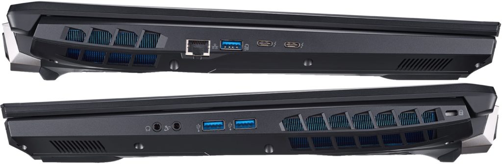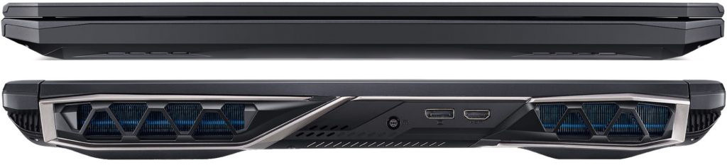 Opisywanie tego, jak zagospodarowano boki laptopa trzeba zacząć od tego, że jest tu „na bogato” i nowocześnie (USB Typu-C, czy też blokada Kensington), ale to co rzuca się od razu w oczy tu brak czytnika kart pamięci. W moim odczuciu warto byłoby dorzucić jeszcze jeden port USB typu A, choćby na tylnym panelu. Co więc właściwie oferują nam krótsze boki Predatora? Port RJ-45, 3 sztuki USB 3.1, 2 sztuki USB Typu-C, 3,5 mm wejście mikrofonowe, 3,5 mm wejście słuchawkowe, oraz wspomniany już port Kensington Lock. Tył to z kolei gniazdo zasilania oraz port DP jak i HDMI, na wypadek gdybyśmy mieli życzenie podpiąć do laptopa zewnętrzny wyświetlacz jak monitor, telewizor czy rzutnik. No dobrze, ale jak to wszystko poukładano. Czy aby wygodnie? Tył jest właściwie zaprojektowany wzorowo. Helios 500, który swoje waży, a co za tym idzie będzie raczej użytkowany przez 90% czasu na biurku gracza, proponując zasilanie oraz złącza HDMI / DP z tyłu, trafia w dziesiątkę – przewody można puścić za biurkiem, by niepotrzebnie nie robiły nam bałaganu tak, jak miałoby to miejsce, gdyby wychodziły z boków konstrukcji. Z kolei złącza na bokach – z uwagi na spory układ chłodzenia – są przesunięte nieco w kierunku użytkownika, ale i tak leżą w dobrym miejscu, niezakłócającym korzystania z konstrukcji.