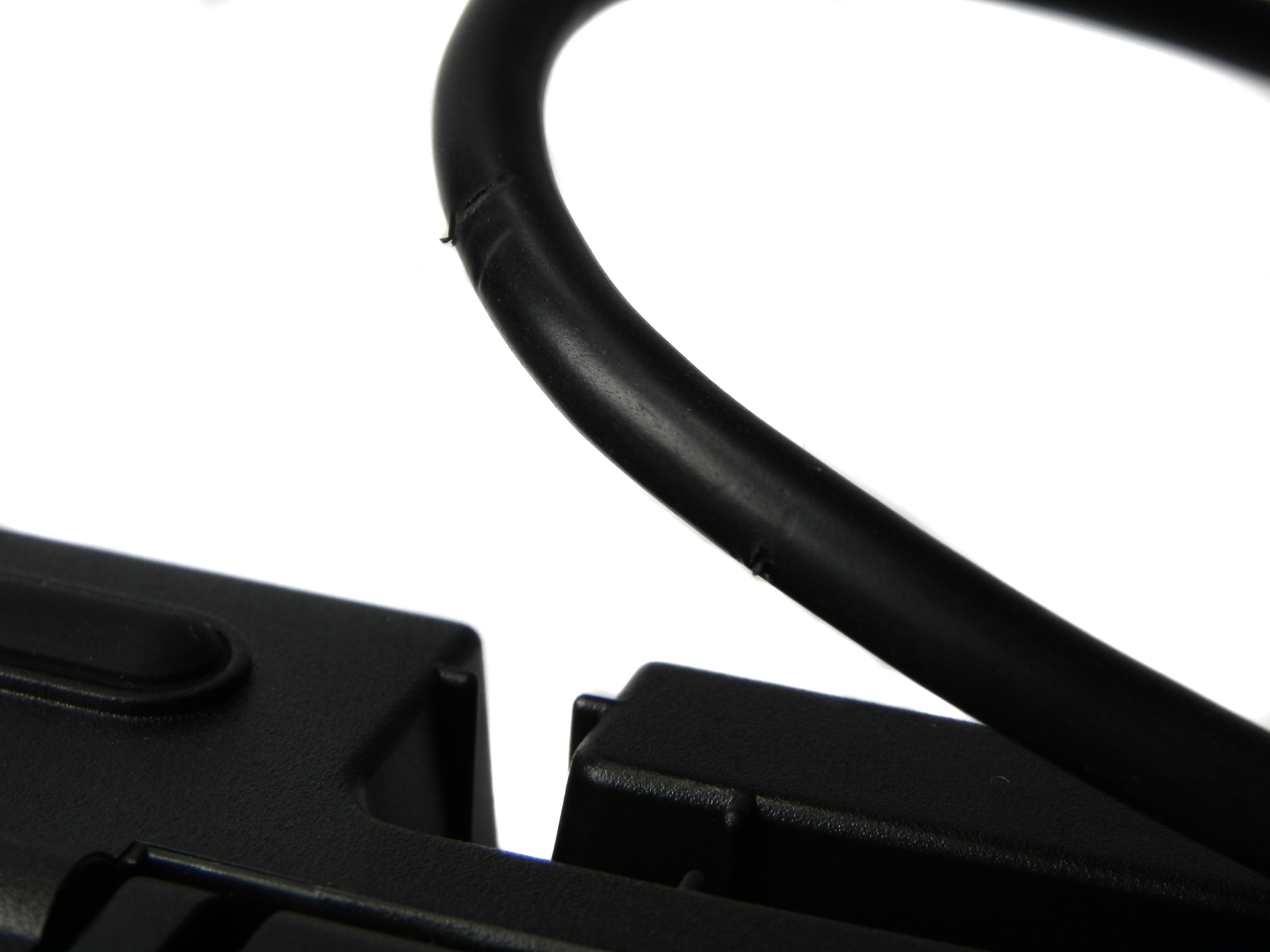 Trochę niepokojąco przedstawia się kwestia 1,8 metrowego kabla USB i prowadnic pod klawiaturą. Sama idea trzech miejsc, gdzie z każdego można wyprowadzić zgrabnie przewód, jest bezsprzecznie plusem. Owe prowadnice posiadają jednak plastikowe zwężenia, które utrzymują kabel. Już po pierwszym wciśnięciu i wyjęciu kabla z prowadnicy zauważyć można wyraźne jego wgniecenia powstałe właśnie w miejscu zwężeń, lub wręcz przetarcia. Po kilku takich manewrach kabel zaczyna wyglądać jak po torturach bardzo tępym nożem obiadowym. Oczywiście miejsce wyprowadzenia kabla z klawiatury zmienia się raczej rzadko (lub w ogóle), warto jednak mieć na uwadze, że każda zmiana tej konfiguracji niesie ze sobą niepożądane następstwa na gumowym oplocie kabla.
