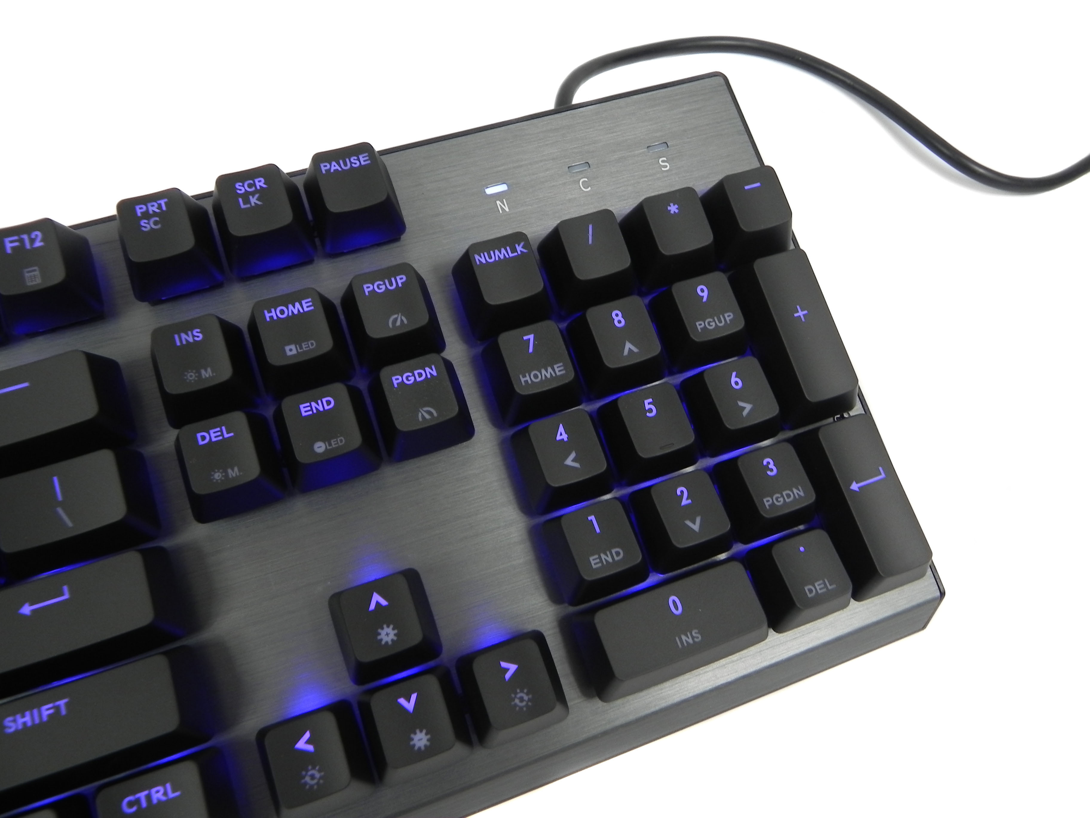 Kluczowy w dokonywaniu zmian jest oczywiście przycisk funkcyjny FN, którego rolę pełni charakterystyczna obwódka logo Cooler Mastera. Zmian w oświetleniu dokonujemy za pomocą FN+INS. Klawiatura oferuje wiele ciekawych ustawień, które cieszą oczy żywymi kolorami. Mamy dostępny efekt „rozpływania” się podświetlenia po naciśnięciu przycisku, imitujący kroplę spadającą do wody. Jest dość intensywny efekt świecących w różnych kolorach kapsli, podświetlenie stałe w różnych barwach/jednobarwne, „wąż” przemieszczający się z góry na dół, efekt pryzmatu czy krótka iluminacja tylko wciśniętych przycisków. Dzięki kombinacji FN+DEL mamy też ledowe tryby Extra, gdzie przykładowo podświetlają się na krótko losowo wybierane przez klawiaturę przyciski przy większości zgaszonej, mamy też coś na wzór retrofuturystycznego odpowiednika klawiatury ze statku kosmicznego, gdzie przyciski zmieniają swój kolor podświetlenia w różnych odstępach czasu. Trzeba przyznać, że Cooler Master potrafi dostarczyć graczom spory wybór w kwestii podświetlenia. Nie inaczej jest z ustawieniami szybkości i jasności.