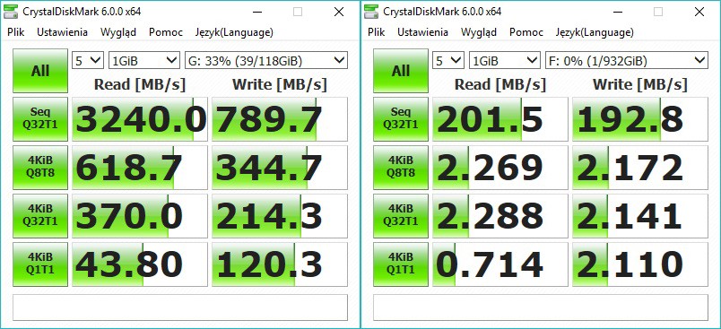 Szybki i droższy SSD obdarzony systemem i większy, a tańszy HDD przeznaczony na dane, to standardowe połączenie dysków, które występuje także w przypadku Legion Y720T. SSD to w tym wypadku Samsung PM961 oferujący 128GB pamięci. 3,5-calowy dysk SATA to z kolei Western Digital, który jak przystało na HDD nie jest aż tak szybki jak mniejszy kolega, ale oferuje przyzwoity 1 TB na przechowywanie danych. Przy intensywnym zapisie i odczycie słychać delikatną metaliczność talerzy WD, ale nie uświadczymy żadnych głośnych pomrukiwań. Poniższe screeny przedstawiają osiągi obu dysków przy zapisie i odczycie danych (SSD Samsung po lewej, HDD WD po prawej). Samsung PM961 okazał się fenomenalnie wydajnym i szybkim urządzeniem, które jest dla odmiany schowane pod kartą graficzną, ze względu na jego kompaktowe, serwerowe rozmiary (format M.2). Na próżno więc nam szukać 2,5-calowego dysku w obrębie obudowy.